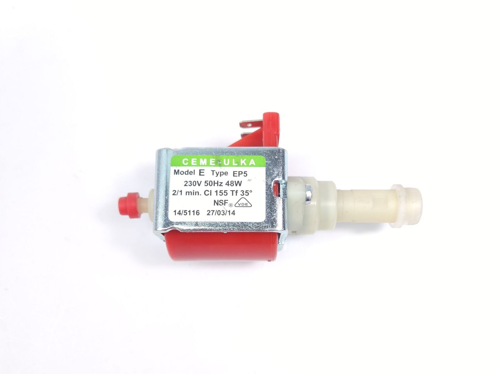 Specs: ULKA Model E Type EP5 230V 50Hz 48W 2/1min. CI 155 Tf 35 degrees NSF & VDE certified for electrical safety and food contact use.