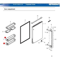 New replacement door shelf DA63-07161B for some Samsung NZ fridge freezers for the two lowest positions on the door - lowest and 2nd from the bottom. This is the same as DA63-07161A but with a silver trim on the shelf edge, they both interchange with one another.