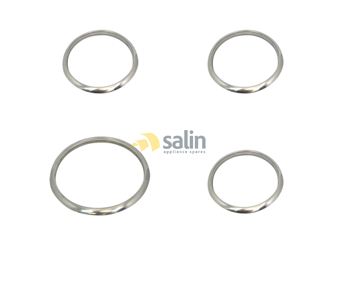 Specifications: COMPELTE SET OF x4. Includes x3 SMALL SIZE SILVER TRIM RING. NO CUT OUTS LARGE TRIM TRIM APPROX. 200MM x1 and SMALL TRIM RING APPROX. 165MM x3. Outside measurement is approx. 198mm and interior 180mm, the three small rings are 165mm outer and 145mm inner measurement, To suit many Electrolux, Westinghouse, Chef and Simpson Cooktops. Also known as other part numbers such as: TR-01, TR-02, TR01, TR02.